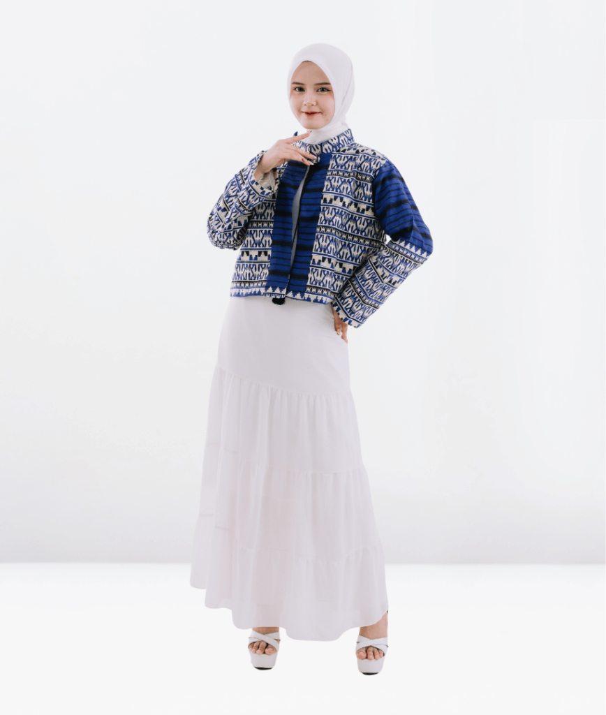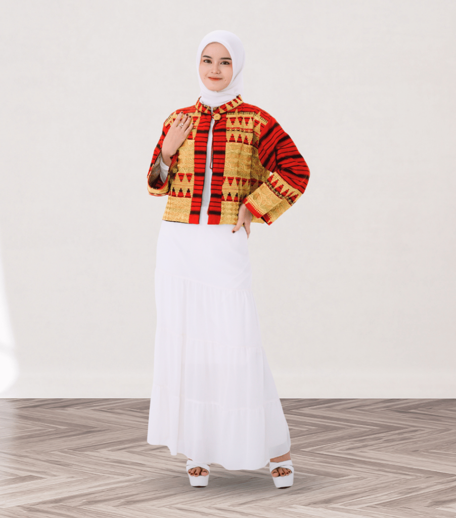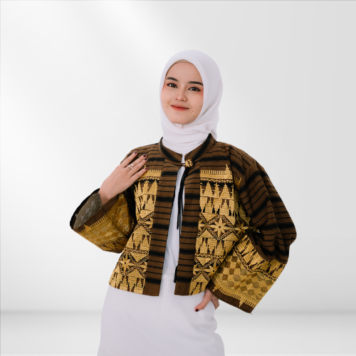 Deskripsi : Busana formal dengan bordir tapis Lampung yang elegan, dipadukan kain tenun.