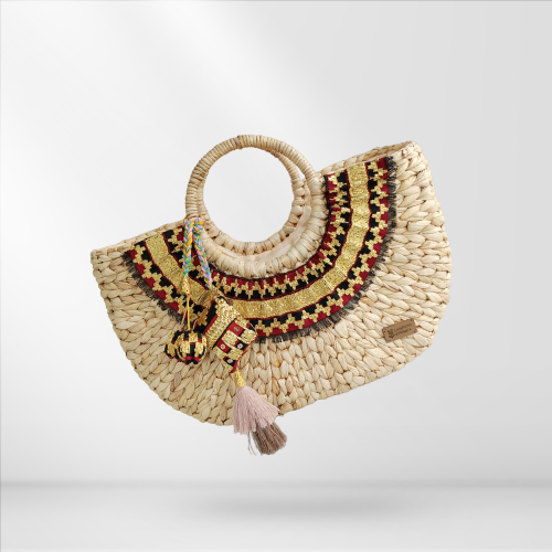 Deskripsi : Tas ramah lingkungan berbahan eceng gondok dan aksen tenun tapis Lampung.