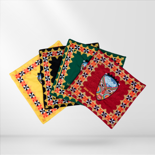 Deskripsi : Sarung bantal untuk dekorasi rumah, menampilkan perpaduan bordir tapis dan kain tenun.