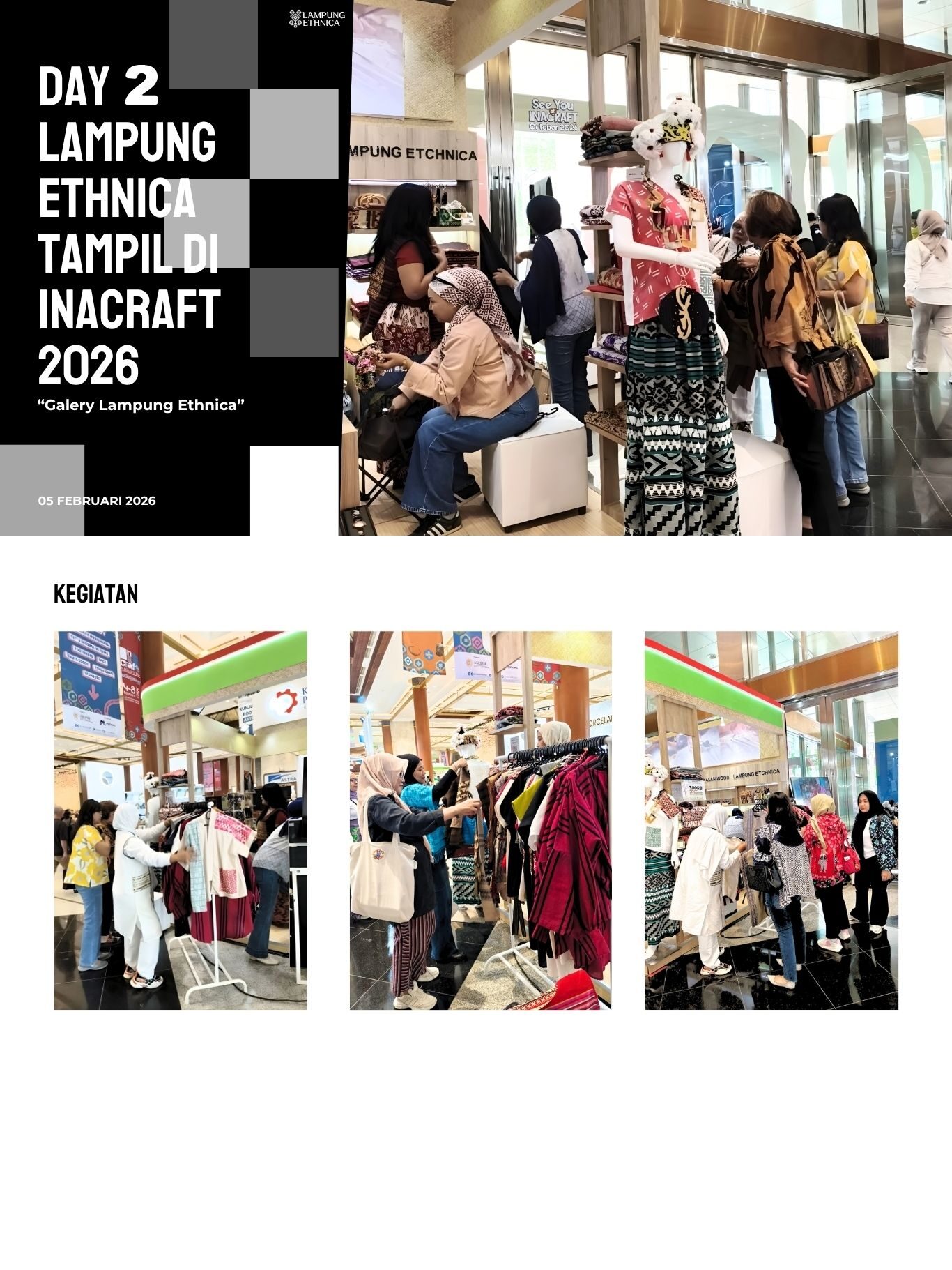 Pada hari Kamis, 05 Februari 2026, bertempat di Galeri Lampung Ethnica, berlangsung rangkaian kegiatan Day 2 Lampung Ethnica tampil di INACRAFT 2026. Hari kedua ini menjadi kelanjutan dari partisipasi Lampung Ethnica dalam ajang pameran kerajinan dan produk kreatif berskala nasional, INACRAFT 2026.