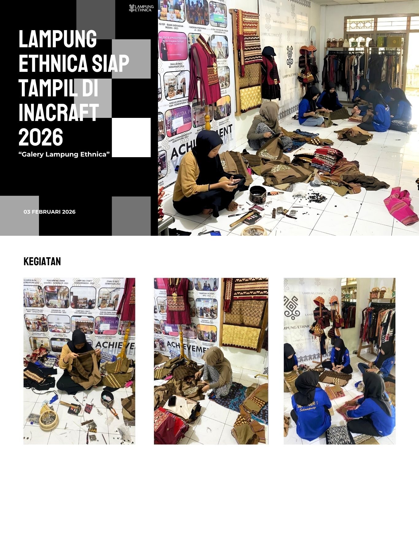 Pada hari Selasa, 03 Februari 2026, bertempat di Galeri Lampung Ethnica, telah dilaksanakan kegiatan persiapan dan penguatan internal sebagai langkah kesiapan Lampung Ethnica untuk tampil di ajang INACRAFT 2026. Kegiatan ini menjadi momentum penting dalam perjalanan Lampung Ethnica untuk membawa karya budaya Lampung ke panggung nasional.