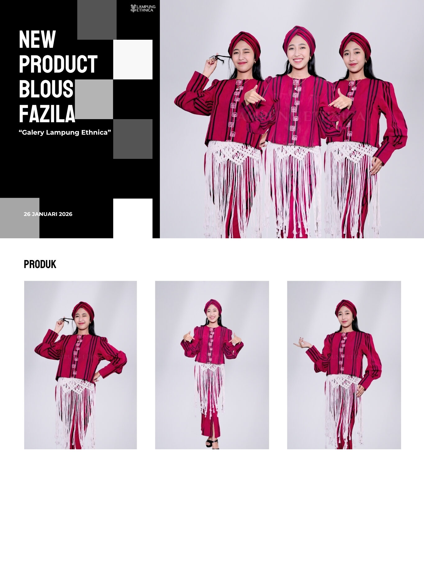 Pada hari Senin, 26 Januari 2026, Galeri Lampung Ethnica menjadi lokasi pelaksanaan kegiatan peluncuran New Product Blous Fazila. Kegiatan ini merupakan bagian dari rangkaian pengenalan produk terbaru Lampung Ethnica yang terus menghadirkan inovasi busana bernilai budaya dengan sentuhan desain modern.
