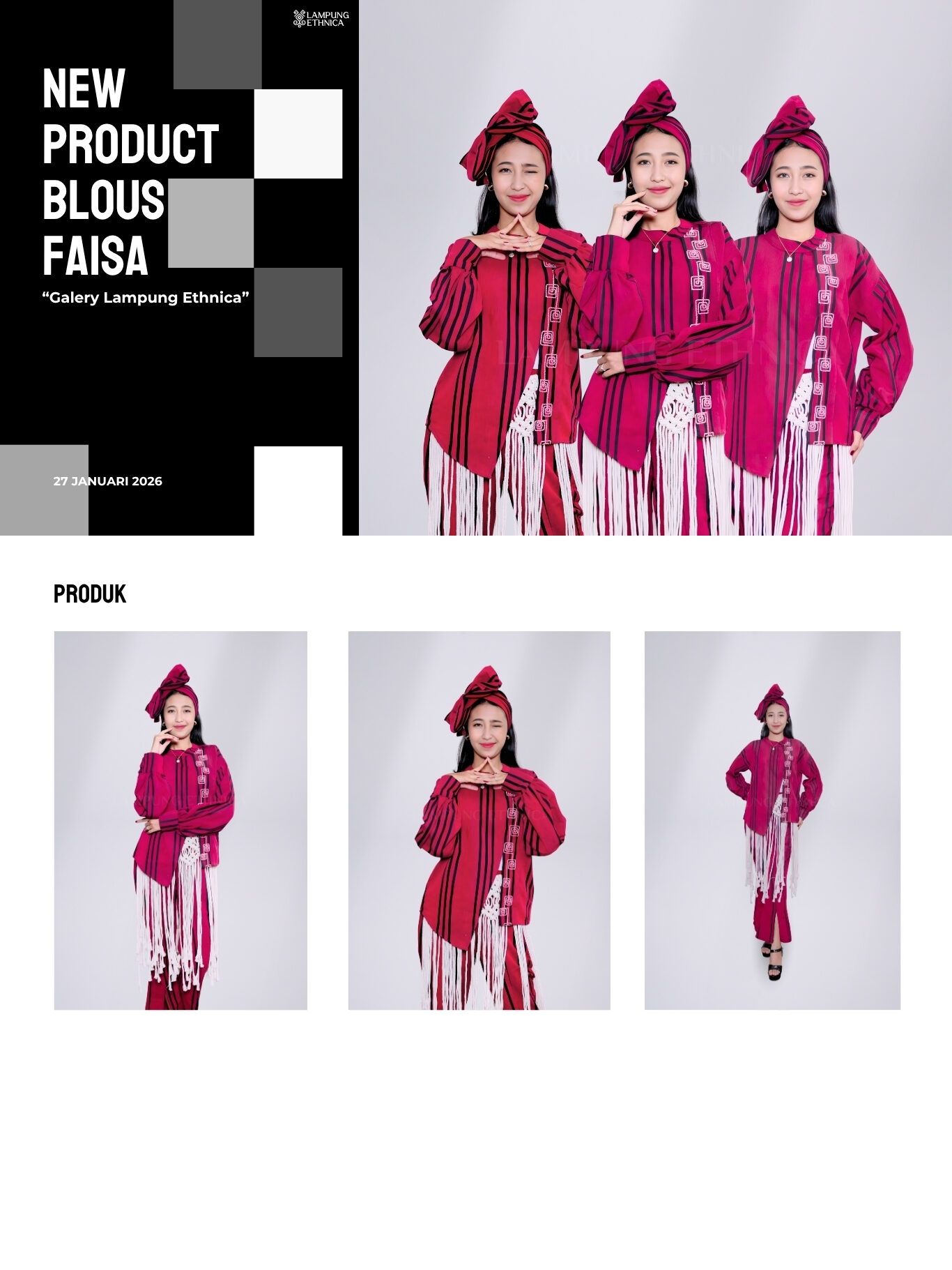Pada hari Selasa, 27 Januari 2026, Galeri Lampung Ethnica menjadi lokasi pelaksanaan kegiatan peluncuran New Product Blous Frisca. Kegiatan ini merupakan bagian dari rangkaian pengenalan produk terbaru Lampung Ethnica yang terus berinovasi dalam menghadirkan busana bernilai budaya dengan sentuhan desain modern.