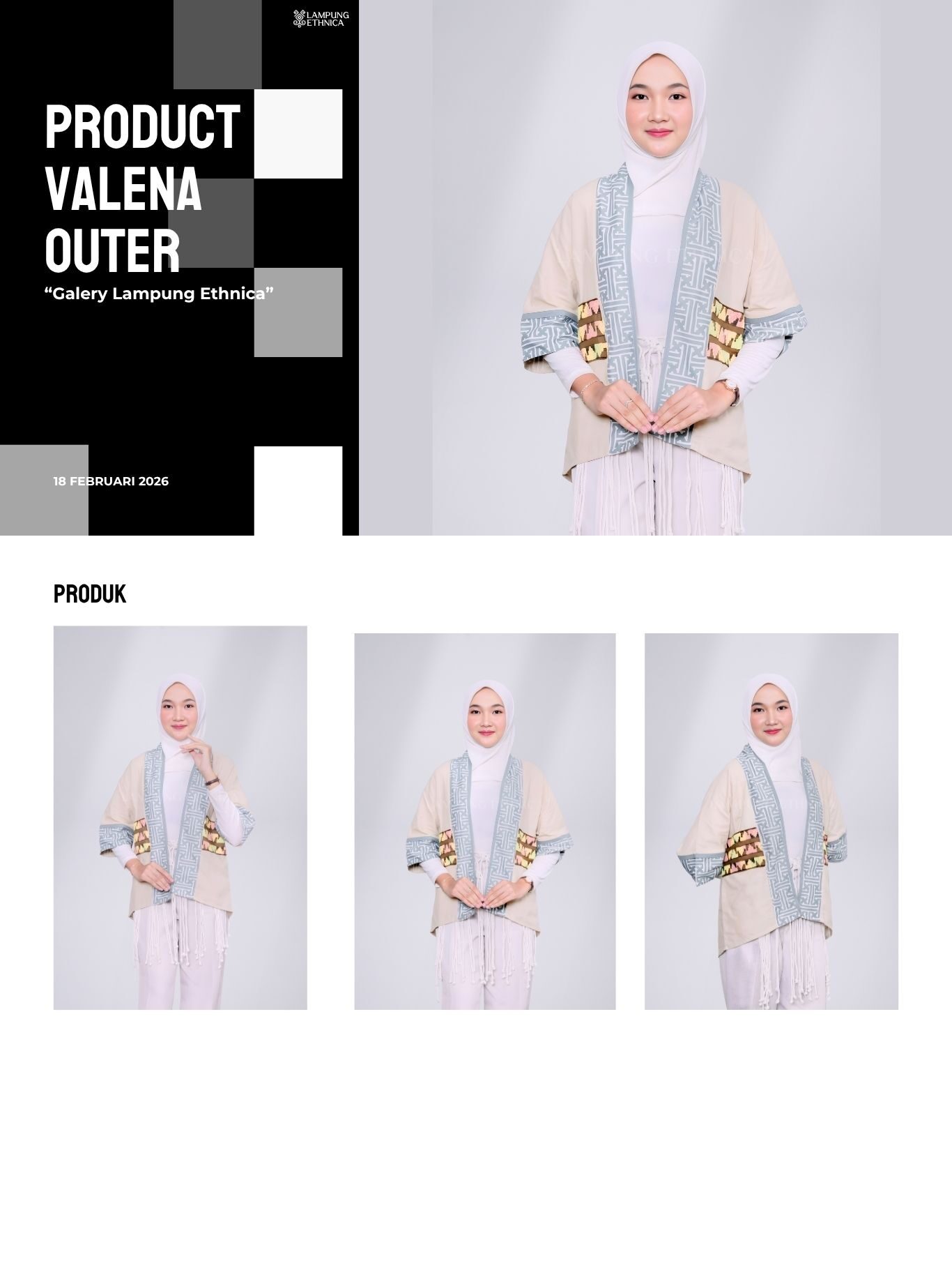 Valena Outer dirancang dengan memadukan keindahan motif tapis Lampung dan sentuhan desain modern yang elegan. Produk ini menghadirkan siluet yang anggun serta detail pengerjaan yang rapi, sehingga memberikan kesan berkelas namun tetap nyaman digunakan dalam berbagai kesempatan.